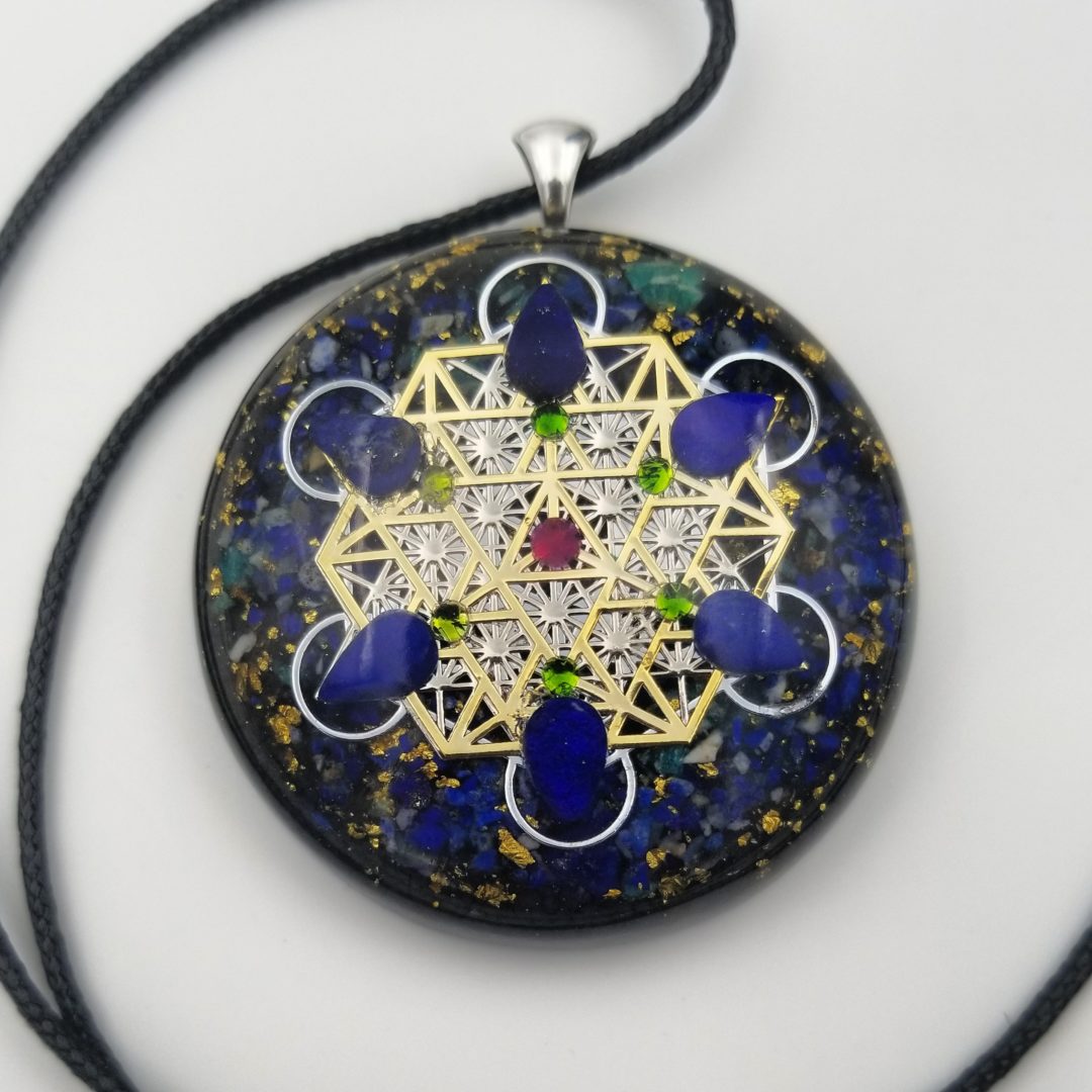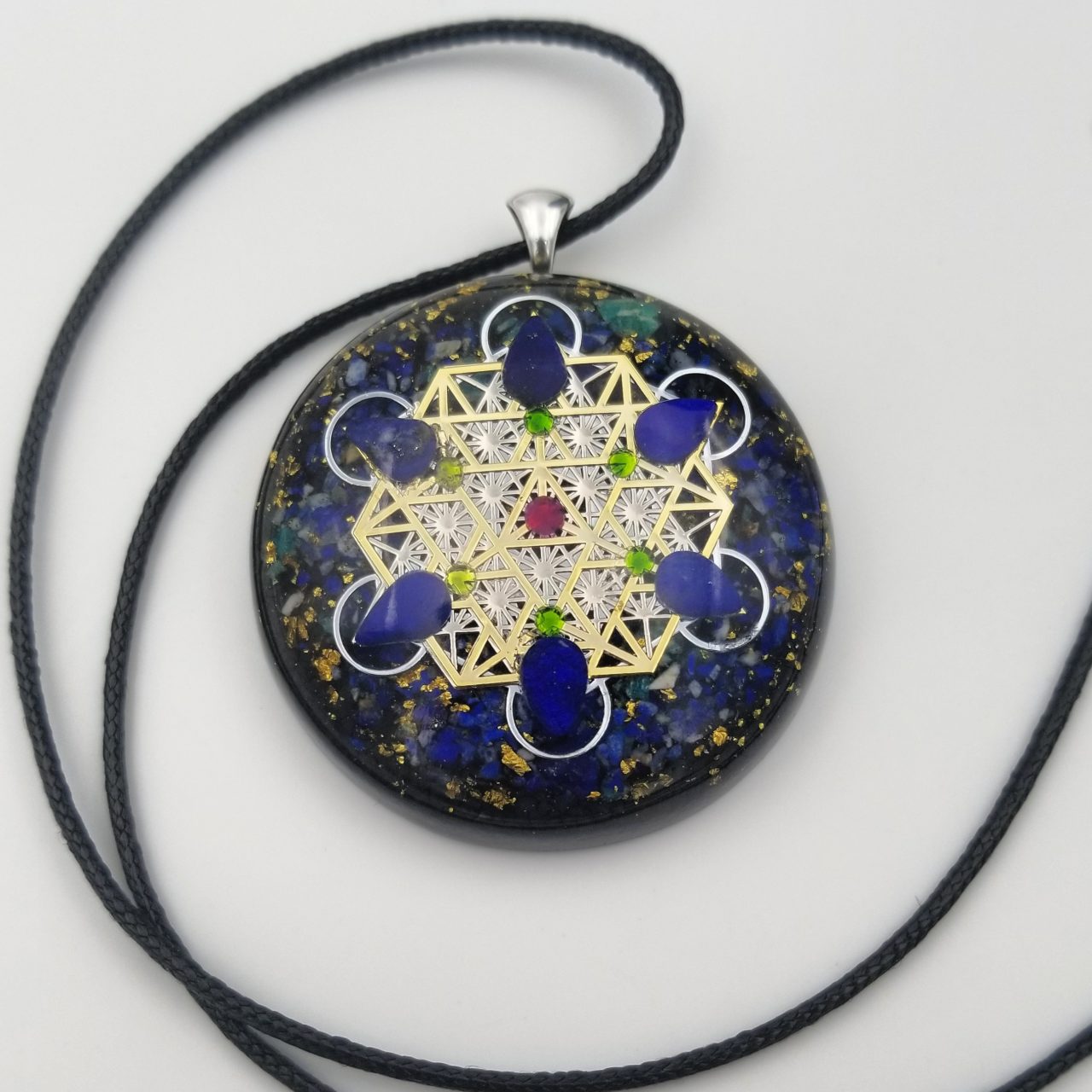 Materials; Metatrons cube and the 64 tetrahedron grid symbols with x1 Ruby, x3 Red Garnet, x6 orange carnelian faceted stones accenting on the top with Red Jasper, orange carnelian, pyrite, and gold leaf behind it. This power house Amulet is loaded with a crystal matrix of; Clear quartz, Amethyst, Super 7, Lapis, amazonite, malachite, green aventurine, yellow calcite, orange carnelian, red garnet, and elite shungite.