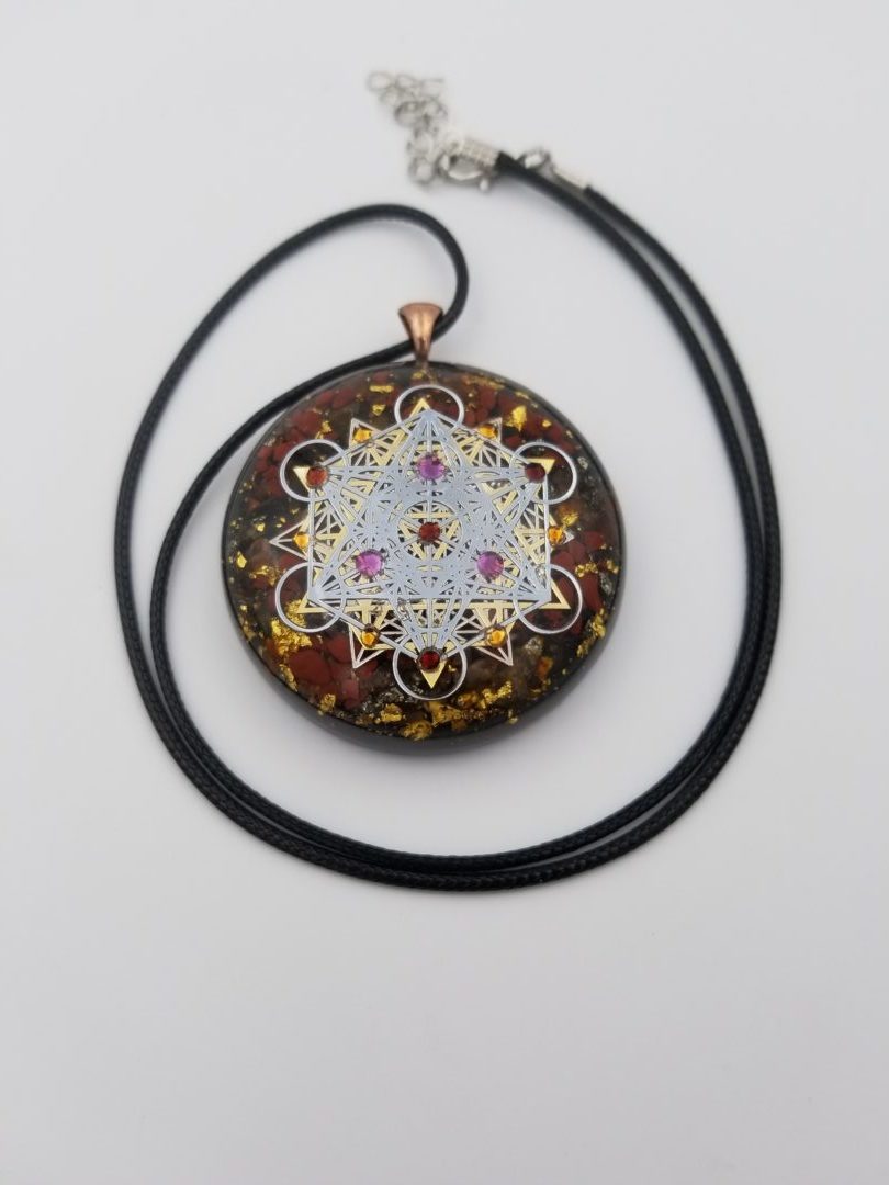 Materials; Metatrons cube and the 64 tetrahedron grid symbols with x1 Ruby, x3 Red Garnet, x3 orange carnelian faceted stones accenting on the top with Red Jasper, orange carnelian, pyrite, and gold leaf behind it. This power house Amulet is loaded with a crystal matrix of; Clear quartz, Amethyst, Super 7, Lapis, amazonite, malachite, green aventurine, yellow calcite, orange carnelian, red garnet, and elite shungite.