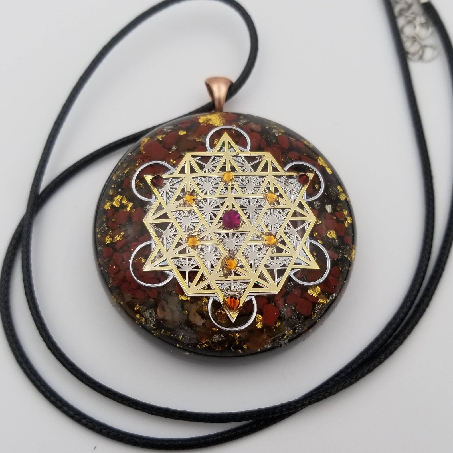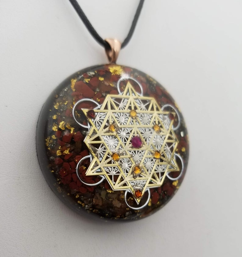 Materials; Metatrons cube and the 64 tetrahedron grid symbols with x3 Amethyst, x4 Red Garnet, x6 orange carnelian faceted stones accenting on the top with Red Jasper, orange carnelian, pyrite, and gold leaf behind it. This power house Amulet is loaded with a crystal matrix of; Clear quartz, Amethyst, Super 7, Lapis, amazonite, malachite, green aventurine, yellow calcite, orange carnelian, red garnet, and elite shungite.